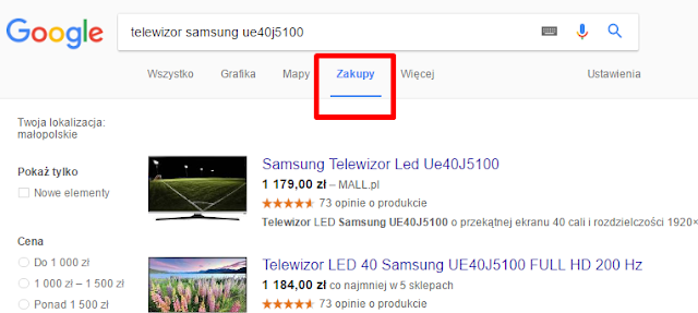 Widziałeś zakładkę w Google – „Zakupy” ? Z jej pomocą możesz przeglądać oferty różnych sklepów internetowych bez odwiedzania oficjalnych stron sklepów. W zakładce są także opinie i możliwości filtrowania.