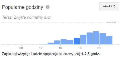 Diagram podpowie Ci w jakich godzinach możesz spodziewać się największego ruchu w danym miejscu. Dodatkowo dowiesz się ile średnio osoby spędzają w tym miejscu czasu. Google pobiera dane z naszych telefonów z systemem Android podczas wizyty w danej firmie.