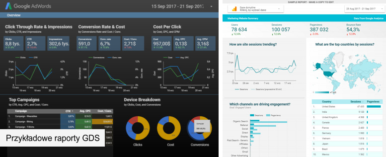 Zaletą systemu jest możliwość wyświetlania danych z różnych źródeł. Możemy połączyć dane z systemów Google AdWords, Google Analytics, własnej bazy danych MySQL, czy arkuszy Google.